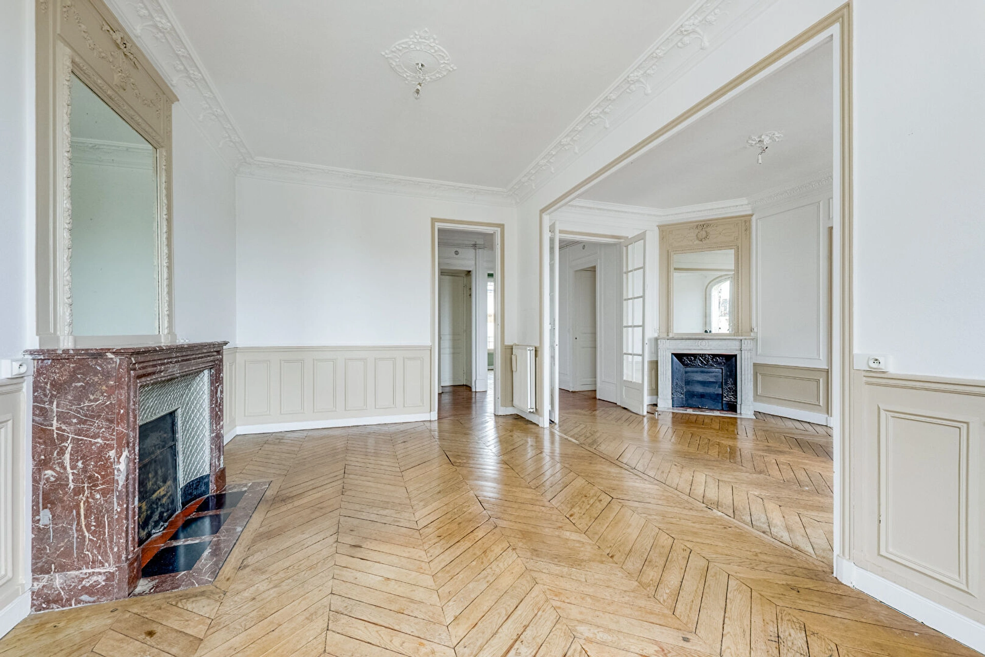 Calme et baigné de lumière, cet appartement séduit par le charme de l'ancien parisien : très belle hauteur sous plafond, moulures, parquet en point de Hongrie et cheminées en marbre.