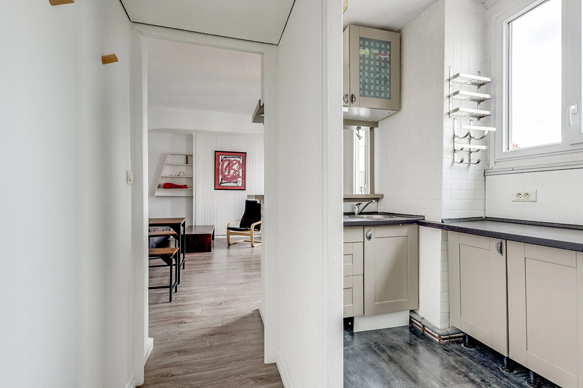 Au 4e et dernier étage SANS ASCENSEUR entièrement au CALME sur cour, le bien se compose d'une entrée, d'un double séjour avec VUE DÉGAGÉE, d'une cuisine semi-ouverte aménagée et équipée, d'une grande chambre avec coin dressing, et d'une salle d'eau avec WC intégrés.